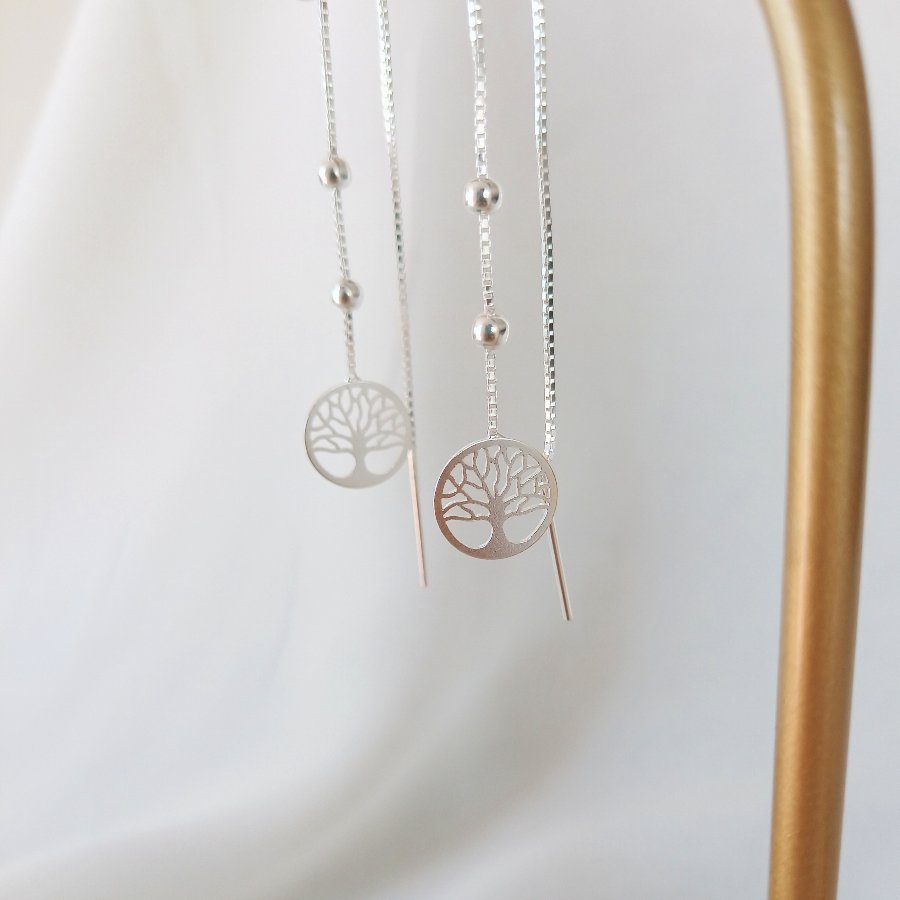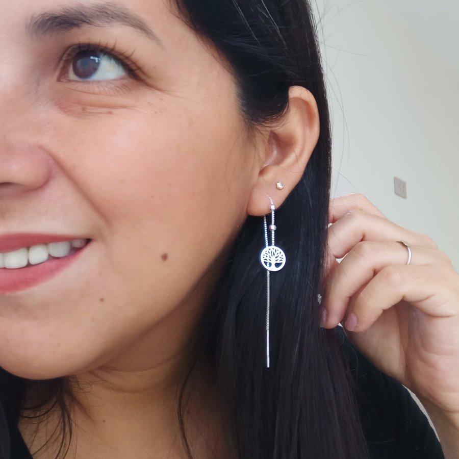 Aretes colgantes en cadena y dije con forma de árbol de la vida en plata 925.
