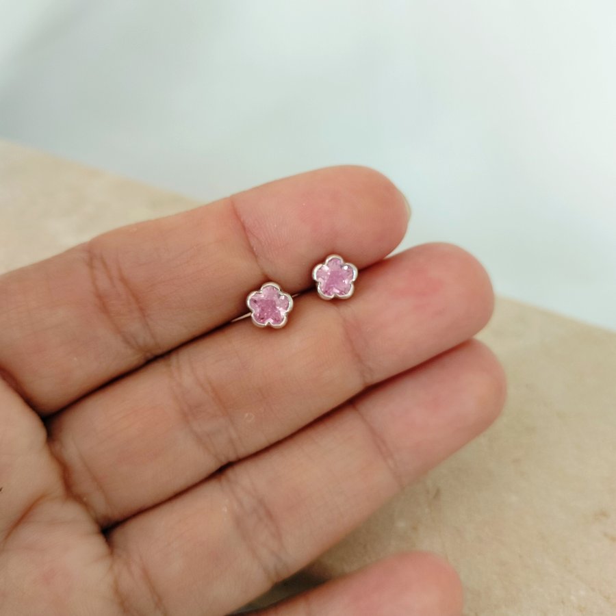 En Plata 950, llevan un zircón en forma de flor color rosa. Broche enroscable, el cual permite usarlo de forma reversible.