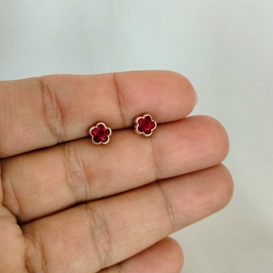 En Plata 950, llevan un zircón en forma de flor color rojo. Broche enroscable, el cual permite usarlo de forma reversible.